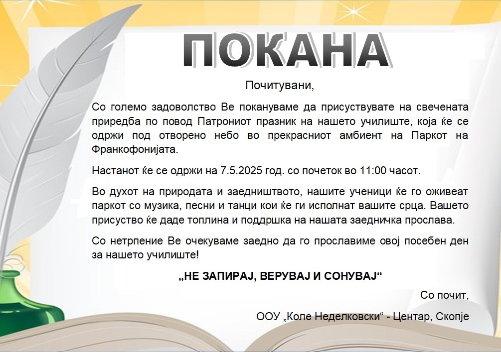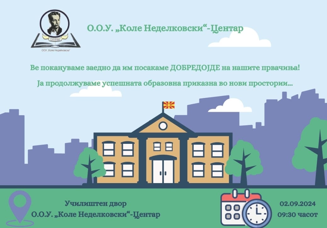 Свечениот прием на првачиња ќе се одржи на 2.9.2024 година (понеделник) во 9:30 часот во училиштниот двор. Со радост ве очекуваме на првиот час и ви посакуваме СРЕЌЕН ПОЧЕТОК !