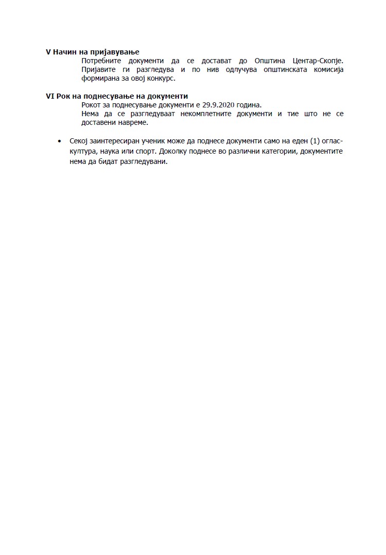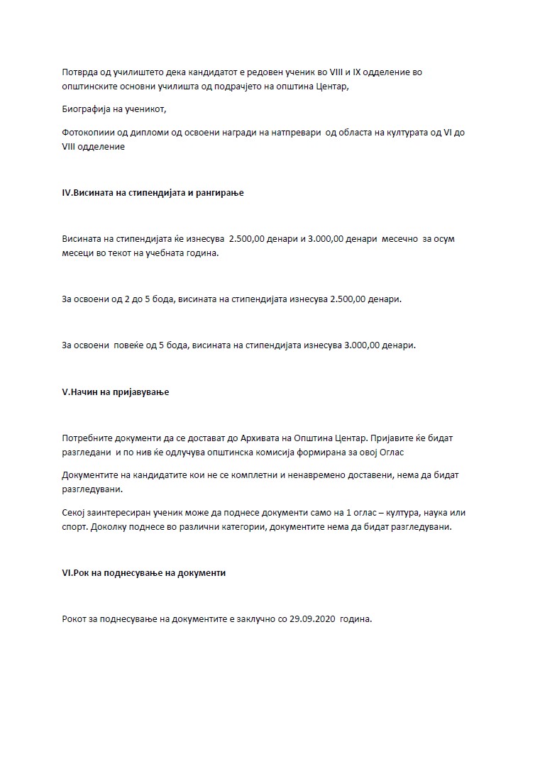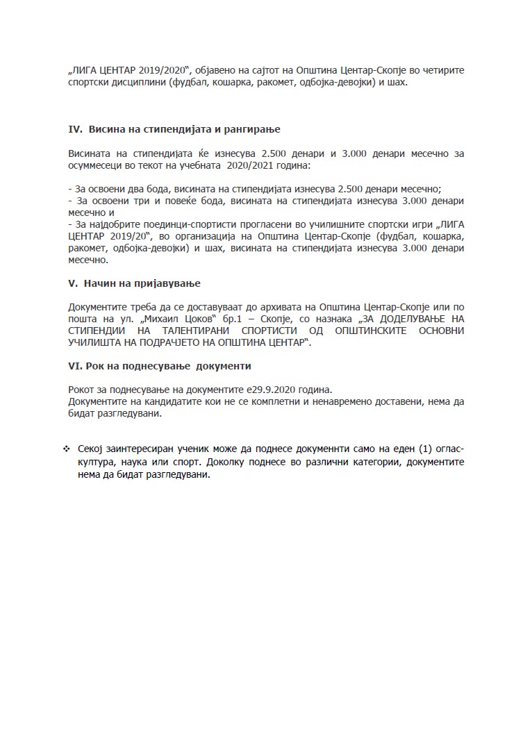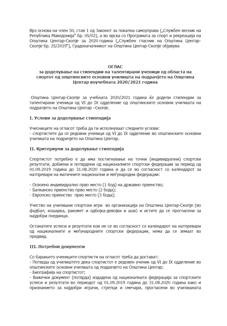ОГЛАСИ за доделување на стипендии на талентирани ученици од општинските основни училишта на подрачјето на Општина Центар во учебната 2020/2021 година